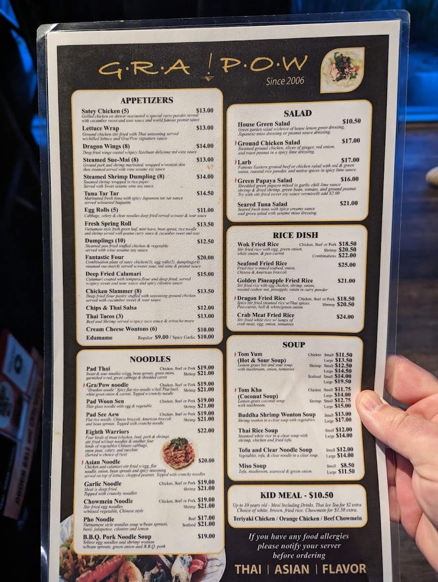 Gra Pow prides itself on attentive service, which shines through in every review. Customers describe the staff as friendly and accommodating, eager to ensure you have a wonderful dining experience. “The service was great. Super friendly,” says Carlos Francisco Rivera, who enjoyed the fabulous drunken noodles and crafted margaritas. Another patron, Greg Vogel, enthusiastically shared images of the beautiful dishes that waft aromatic scents, inviting others to indulge in the diverse menu ranging from hearty noodles to refreshing salads.