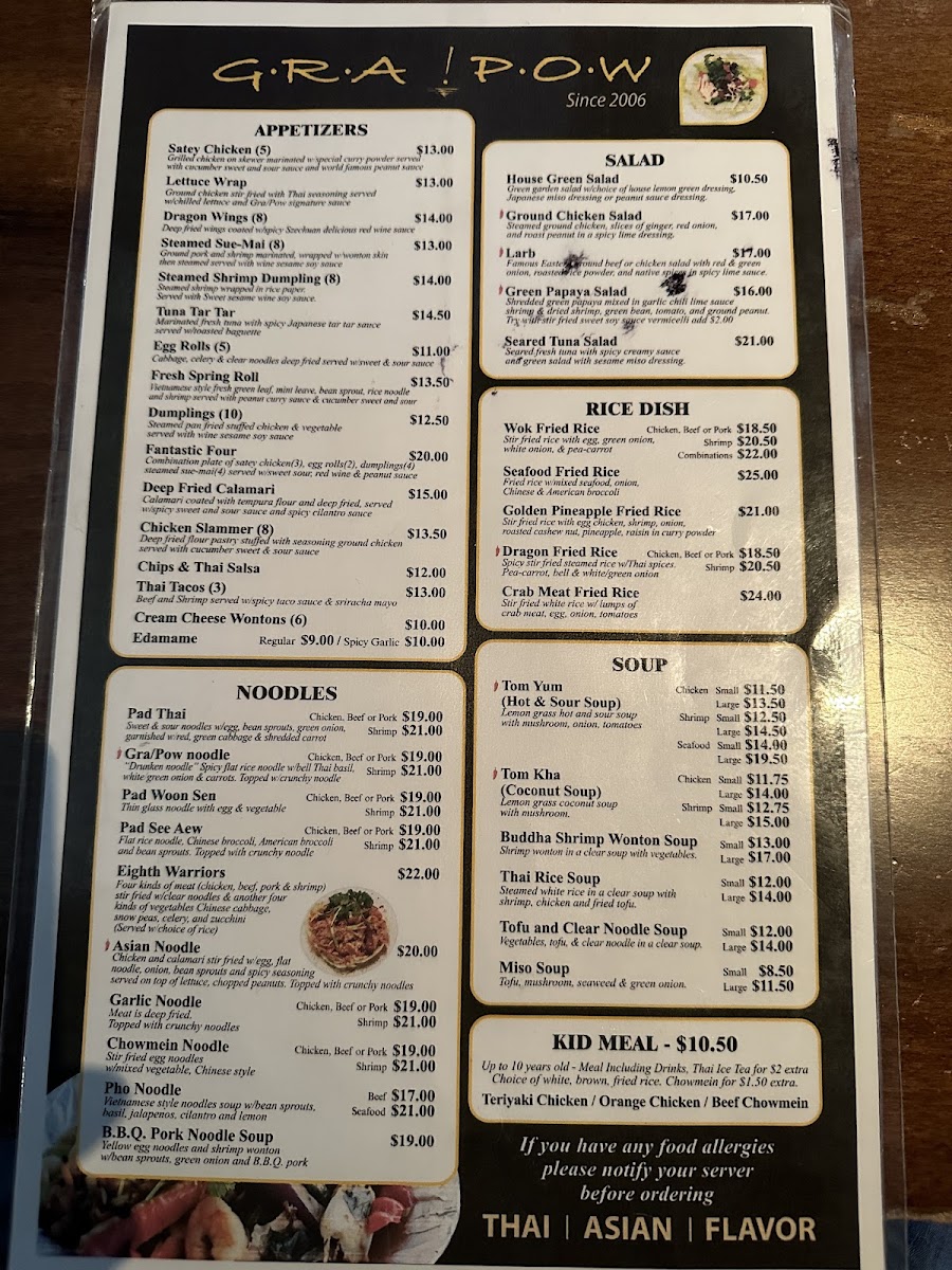 After your meal, be sure to take advantage of their impressive beer selection and happy hour specials, which offer a medley of tantalizing appetizers sure to complement your feast. Gra Pow truly embodies the essence of Thai dining—with fresh ingredients, bold flavors, and a welcoming atmosphere. Whether you're a seasoned fan of Thai cuisine or trying it for the first time, Gra Pow delivers an unforgettable experience that leaves you wanting to return again and again.